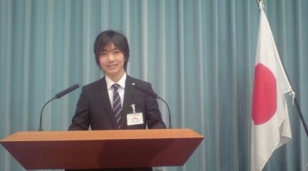 で、今回の研修で僕が何を一番楽しみにしていたかというと、それは首相官邸見学です。ウチの会社だけの力では、とても見学なんてできないような所らしいので、テレ東サマサマって感じでした。豪華ホテルのようなロビーを経て、記者会見室に案内されると、そこは緊急会見の時とかにテレビでよく見る場所でした。日の丸がまぶしいぜ!塩崎官房長官に少し説明してもらった後は、みんなで記念撮影。いやぁ、いい思い出になりました。