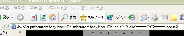 JavaScript:document.body.innerHTML=document.body.innerHTML.split('ー').join('━━━(゚∀゚)━━━');focus();